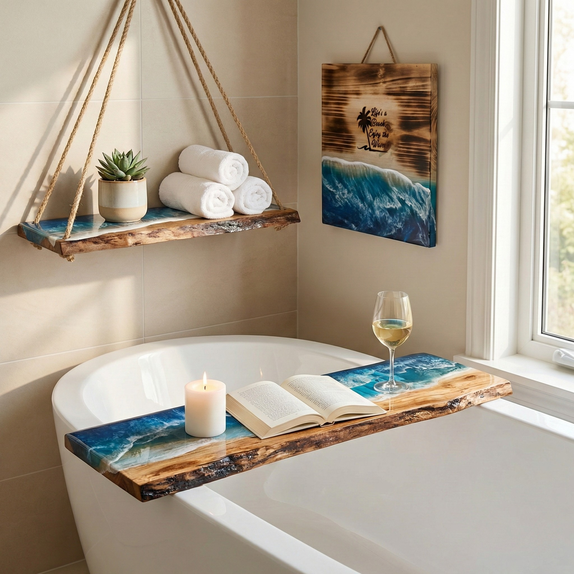 The Wooden Live Edge Bath Caddy Tray, a perfect addition to your bath time routine that brings the calming vibes of the beach right into your bathroom. Also a Unique touch to your Bathroom Decor.