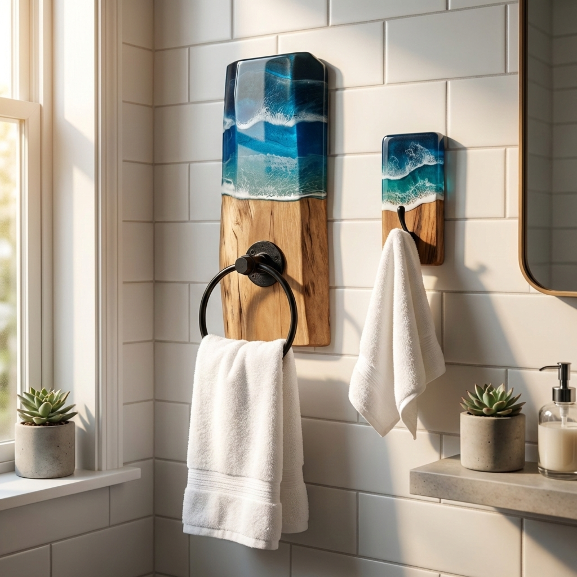 The Beach Epoxy Ring Towel Holder / Display is beautifully crafted to bring the serene and calming vibes of the beach right into your Bathroom. Whether you want to use it for display or for functional purposes, this is the perfect addition to any home.